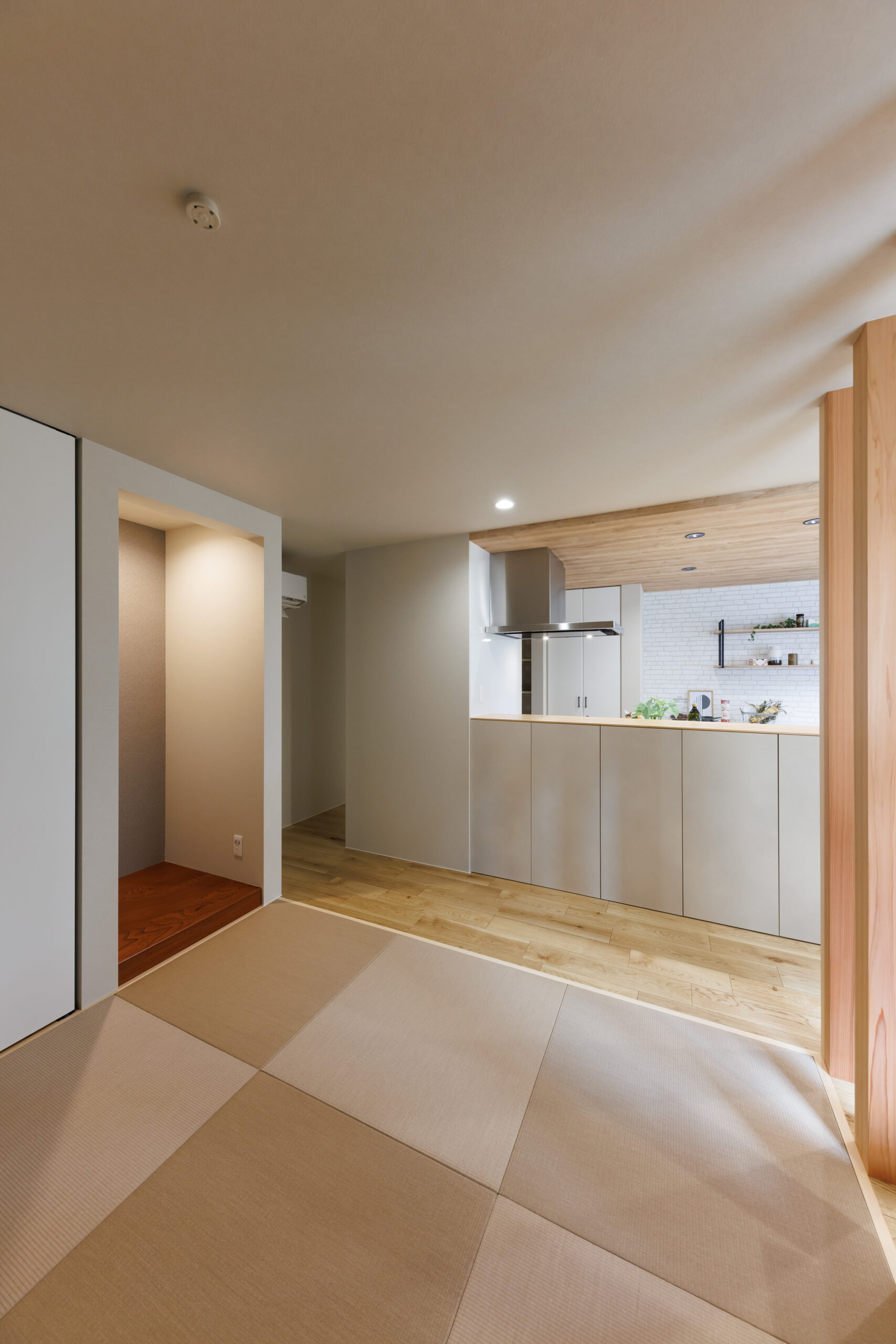 建具をホワイト、壁紙をベージュ、床材にはナラ材を選んだ統一感あるジャパンディスタイルの住まい。