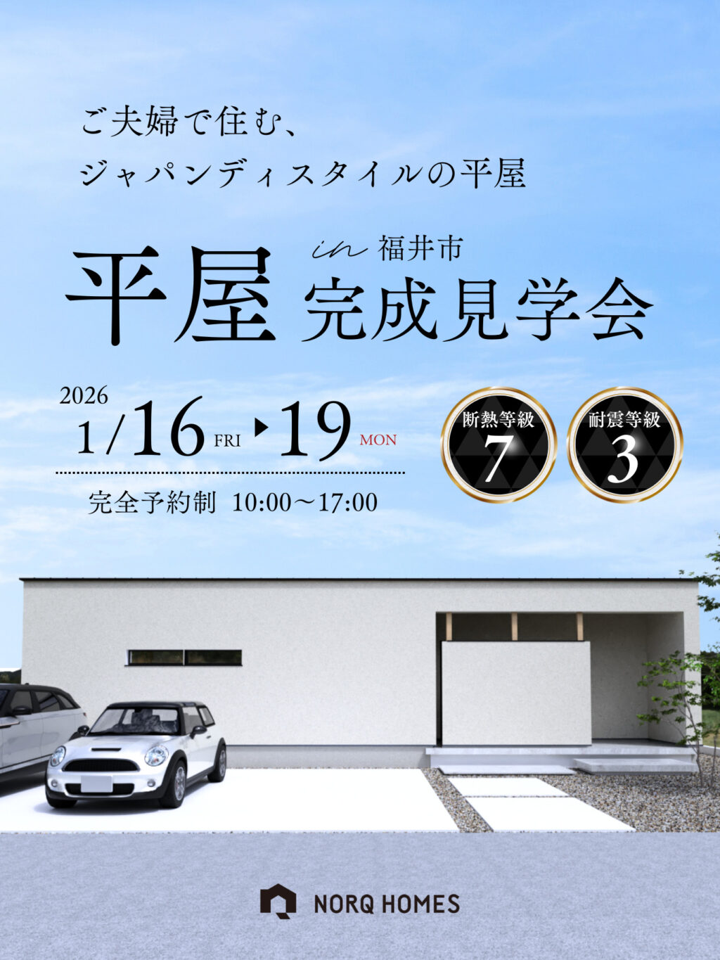 【福井市 完成見学会】1月16日~19日開催!ご夫婦で住む、ジャパンディスタイルの平屋。【30坪/2LDK】