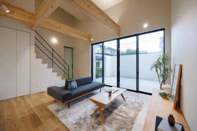 吹き抜けと大開口の窓、室内とつながるタイルテラスで