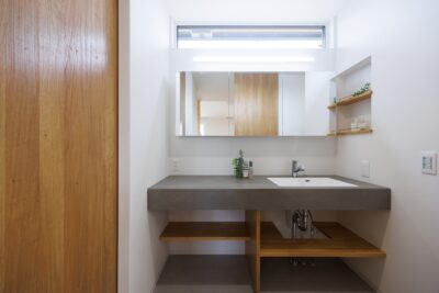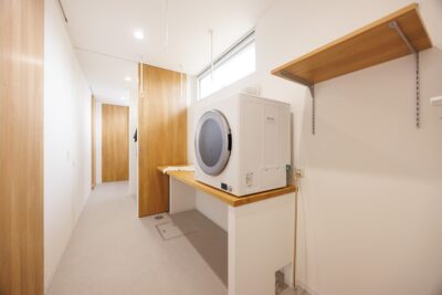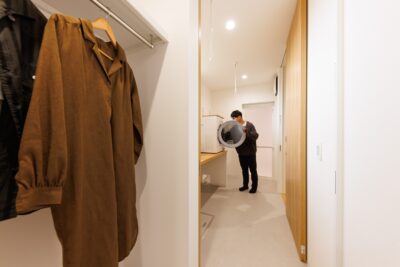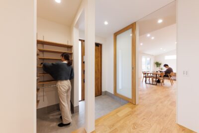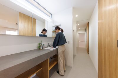 玄関から右手には寝室や洗面・トイレをまとめ、プライバシーを確保しながらも生活動線を短く。