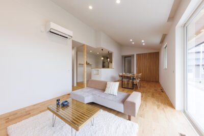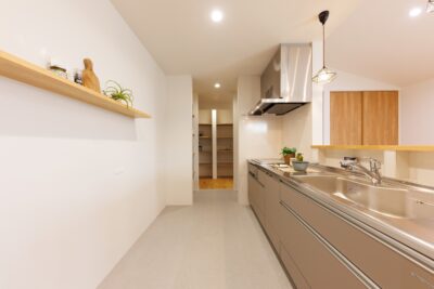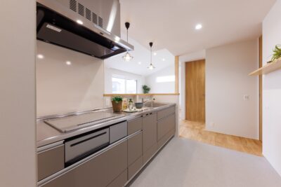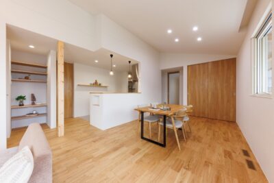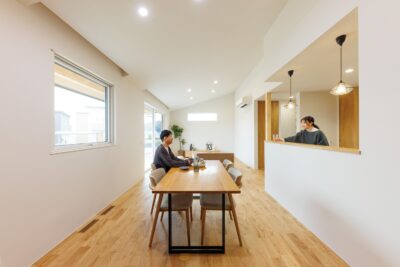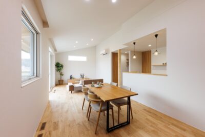 一方で左手に広がるLDKは、勾配天井の開放感と家族が集いやすい空間です。