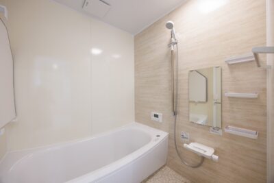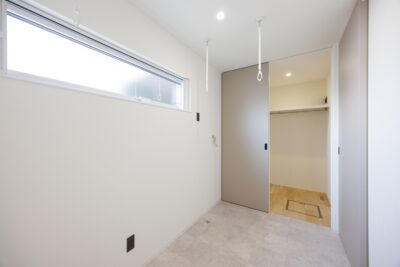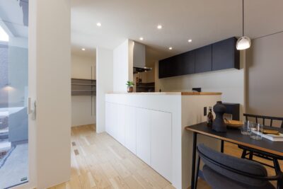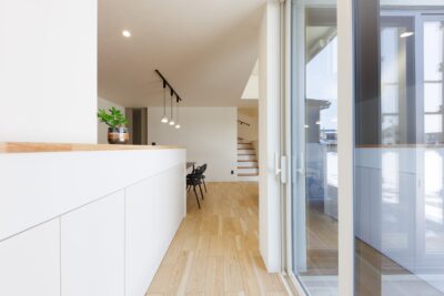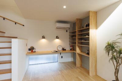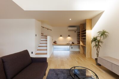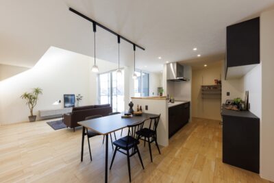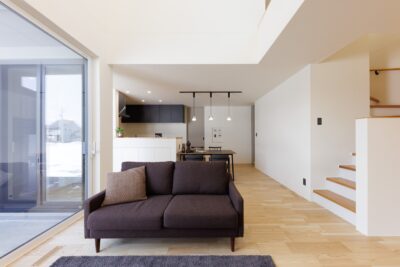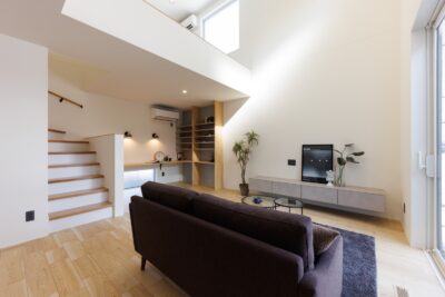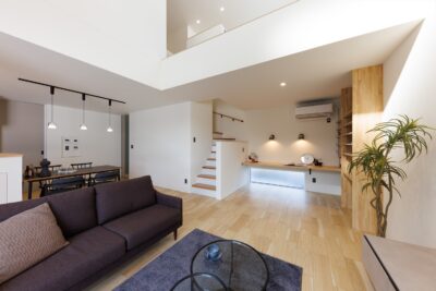 室内はジャパンディをテーマに、無垢床ややわらかな色合いでまとめ、吹き抜けのあるリビングには明るさと開放感が広がります。
