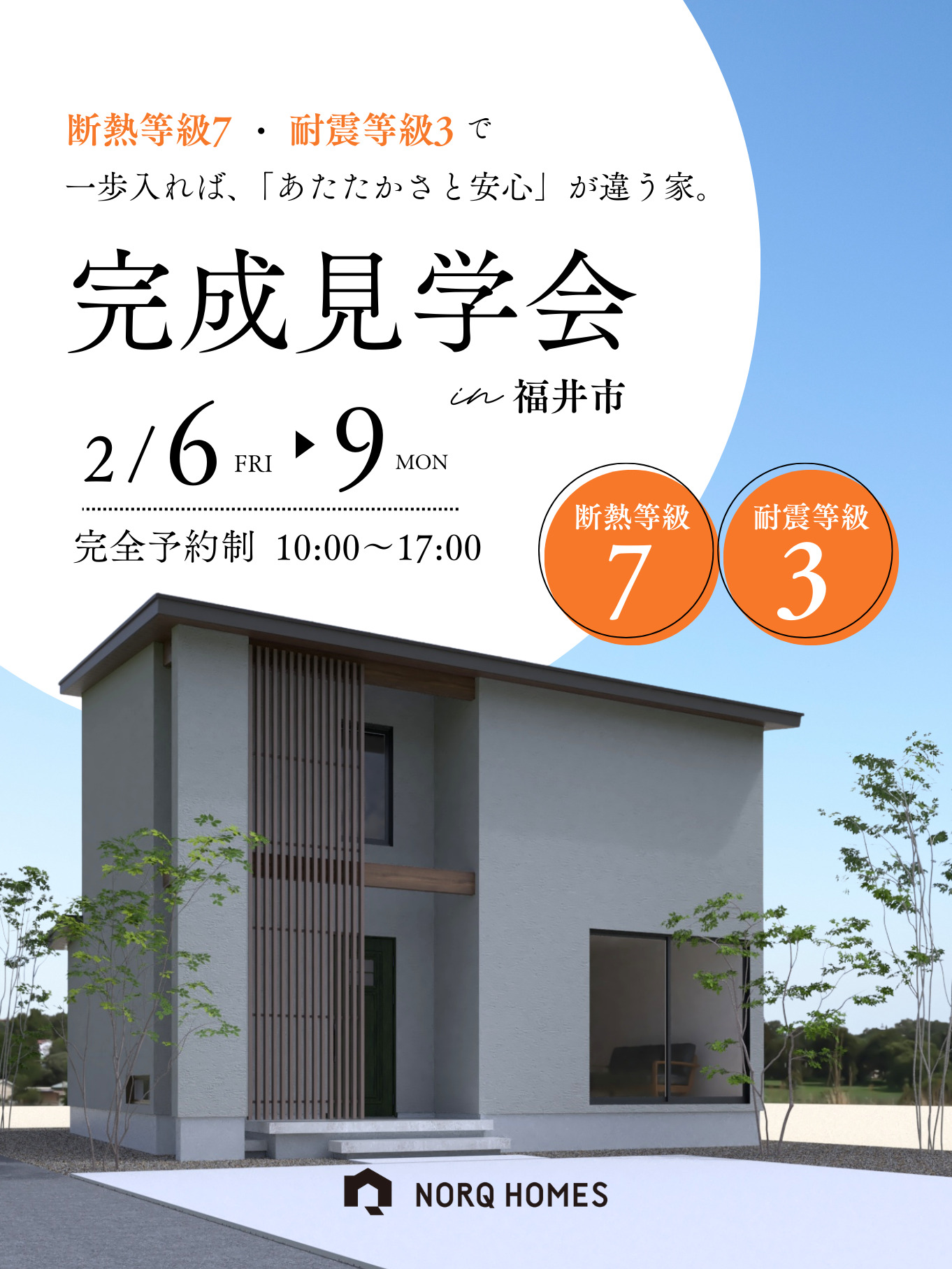 【福井市 完成見学会】2月6日~9日開催!断熱等級7・耐震等級3で、一歩入れば「あたたかさと安心」が違う家【35坪/3LDK】 2024年3月12日 開催日 時間 開催場所 目次1 子育て世代が考えた!性能も、間取りも、暮らしやすさも我慢しない住まい。1.1 リアルな家づくりを体感できます!1.2 建物だけでなく土地の相談も可能1.3 資金計画も相談できる2 設計士・プランナーにインタビューしました2.1 この家で住まう人たちには、どのような暮らしをしてほしいですか?3 Promise4 ノークホームズ3つのお約束4.1 どんなご相談でも、誠実にお応えします。4.2 しつこい営業行為は行いません。4.3 お客さまファーストの見学会です。5 FLOW6 見学会当日の流れ6.1 物件の見学・住宅性能等の説明6.2 アンケートへのご記入6.3 弊社特徴の説明7 断熱等級7・耐震等級3の最高ランクこの家で始まる、家族の新しい日常心地よさをぜひ体感してください。8 見学会申し込みフォーム 子育て世代が考えた!性能も、間取りも、暮らしやすさも我慢しない住まい。 お子さまの誕生をきっかけに、これからの家族の暮らしを見据えて始まった家づくり。冬の寒さや収納不足、使いづらい動線など、賃貸住宅で感じていた住まいの悩みを解消する、性能を重視した住まいが完成しました。調理しやすいキッチンを中心に、自然と家族がリビングに集まる間取り。廊下や階段は少し広めに設計し、ゆとりを感じられる“廊下レス”な空間を実現しています。収納も充実し、毎日の暮らしがすっきり整います。 benefits of visiting ご来場3つのメリット リアルな家づくりを体感できます!カタログや資料だけでは分からない、お施主様がこだわった家事動線や収納スペースの工夫などを実際にご体感いただくことで、家づくりのイメージが膨らみます。 建物だけでなく土地の相談も可能土地もノークホームズでご紹介できます。条件、費用、土地の形、環境など、プロが実際に現地を確認してからお客様へご提案致しますので安心してご相談ください。 資金計画も相談できるノークホームズは、いくらまでなら無理なく払っていけるかを大切に、資金計画のご提案をさせていただきます。家づくりの第一歩にまずは見学会にお越しください。 highlights 見学会の見どころ 外からの視線をやわらかく遮り、外観にアクセントを与える格子 広さを感じる間取りで、移動しやすく開放感のある住まい 行き止まりのない、ストレスフリーな回遊動線 必要な場所に確保した、充実した収納計画 デザイン性とお手入れのしやすさを両立した、こだわりの内装 「断熱等級7」(Ua値 0.26 C値 0.13)を誇る、ノークホームズのダブル断熱。 INTERVIEW 設計士・プランナーにインタビューしました この家で住まう人たちには、どのような暮らしをしてほしいですか?この家では、家族が無理なく、自然体で過ごせる毎日を大切にしてほしいと考えました。高気密・高断熱による快適さを土台に、季節を問わず心地よく、どこにいても家族の気配を感じられる住まいです。 キッチンを中心に自然とリビングに集まり、何気ない会話が生まれる。 休日には庭で過ごしたり、家でゆったりくつろいだりと、「家にいる時間が好きになる」暮らしを楽しんでいただけたら嬉しいです。 Promise ノークホームズ3つのお約束 どんなご相談でも、誠実にお応えします。仕様やコスト、プランづくりのポイントについてのご質問はもちろん、実際の家づくりの進め方や資金計画、土地の悩みなどのお問い合わせにも、誠実に対応させていただきます。 しつこい営業行為は行いません。個別相談中やその後のしつこい営業は行いませんので、安心してご来場ください。 お客さまファーストの見学会です。ごゆっくりと見学いただくために、事前ご予約をお願いしています。ご予約フォームよりお気軽にご予約をお願いいたします。お電話でも大歓迎です! FLOW 見学会当日の流れ 物件の見学・住宅性能等の説明お部屋の間取りなどを一通りご案内します。 なぜこの間取りになったのか?なぜこの外観デザインなのか? などのプランについてご説明いたします。 気になることは何なりとご質問ください。 アンケートへのご記入アンケートをご記入いただくことで、お客さまに合ったスムーズな打ち合わせが可能になります。 弊社特徴の説明ノークホームズの基本性能や基本仕様、コンセプトについて解説いたします。 疑問に思ったことは何でもご相談ください。もちろん、土地探し&資金計画のご相談も可能です! 断熱等級7・耐震等級3の最高ランクこの家で始まる、家族の新しい日常心地よさをぜひ体感してください。 高気密・高断熱による快適さを土台に、家族が自然と集まり、毎日を心地よく過ごせる住まいが完成しました。キッチンを中心にした回遊動線、ゆとりを感じられる間取り、使う場所ごとに考えられた収納計画。暮らしがもっと良くなる工夫を詰め込みました。休日には庭でBBQを楽しんだり、リビングでゆったり過ごしたり。忙しい毎