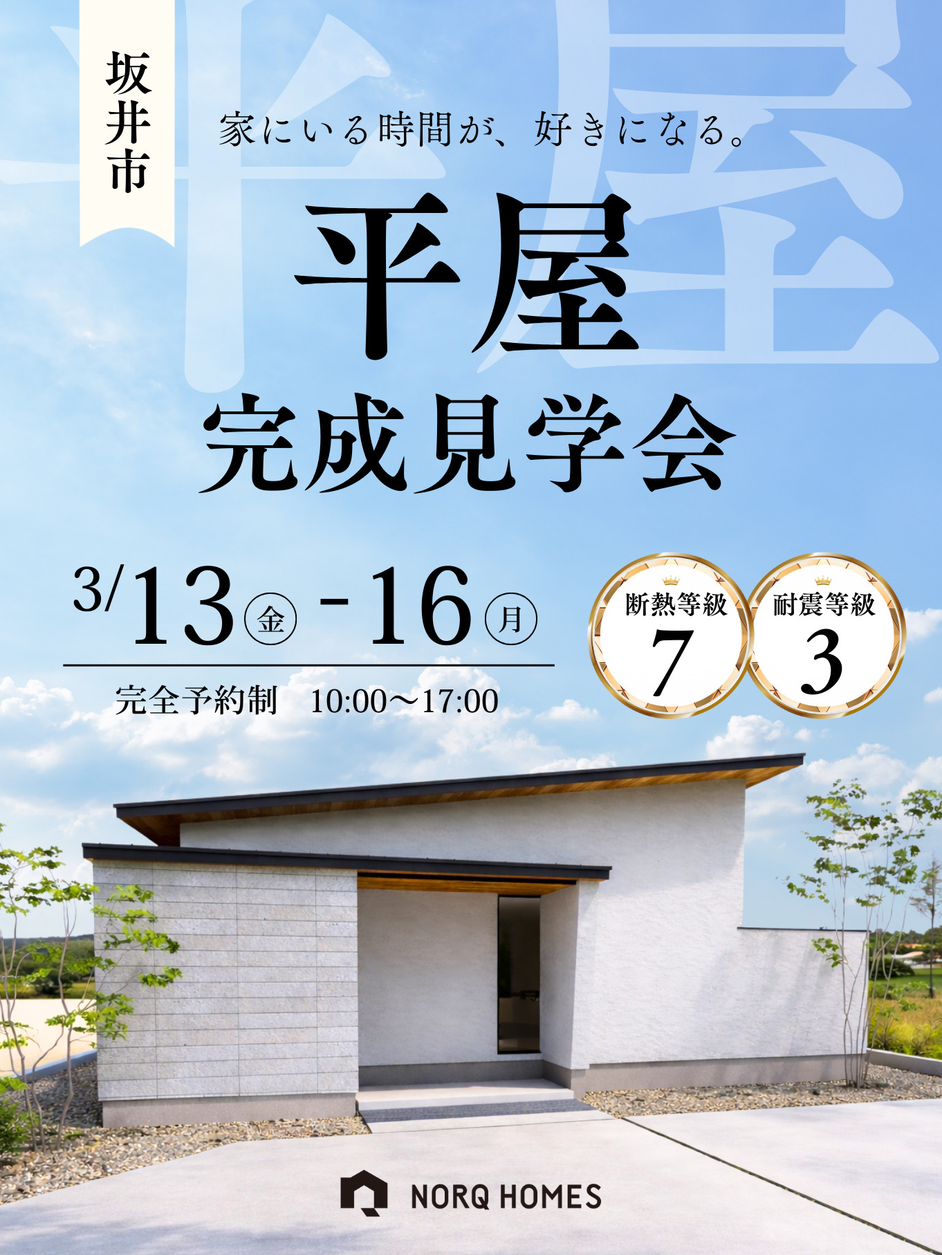 【坂井市 平屋完成見学会】3月13日~16日開催!家にいる時間が、好きになる平屋【27坪/2LDK】