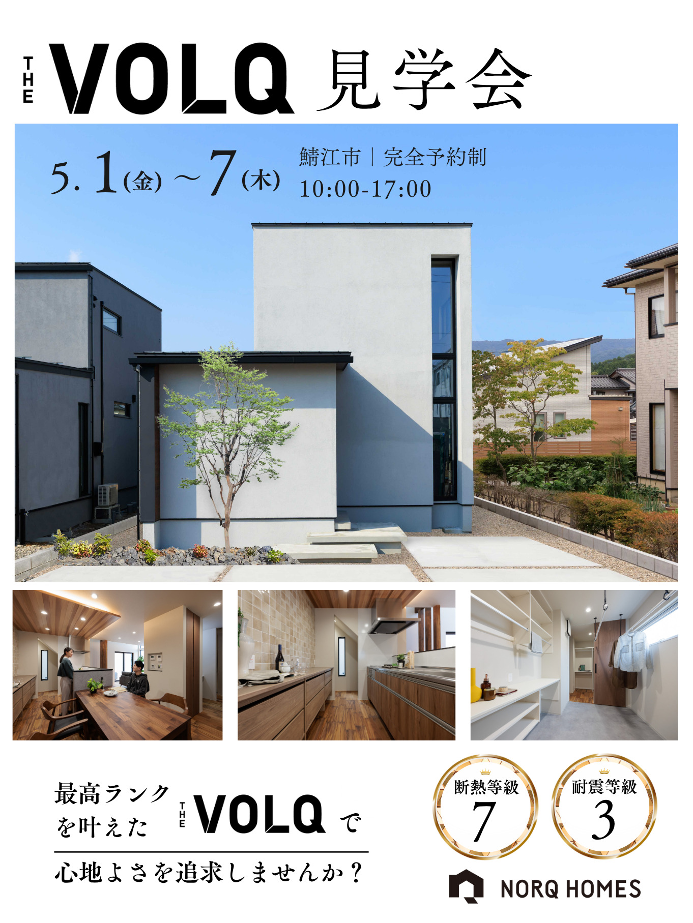 【カスタム住宅VOLQ 見学会】5月1日~7日開催! 断熱等級7×耐震等級3の最高ランクを叶えた“VOLQ”、心地よさを追求した住まい 2024年4月13日 開催日 時間 開催場所 目次1 ABOUT2 コンセプト3 WHAT IS 「VOLQ」4 フォルクとは5 Promise6 ノークホームズ3つのお約束6.1 どんなご相談でも、誠実にお応えします。6.2 しつこい営業行為は行いません。6.3 お客さまファーストの見学会です。7 FLOW8 見学会当日の流れ8.1 物件の見学・住宅性能等の説明8.2 アンケートへのご記入8.3 弊社特徴の説明9 断熱等級7・耐震等級3の最高ランク光と動線にこだわり抜いた設計で、日常の心地よさを叶えた住まい。10 見学会申し込みフォーム ABOUT コンセプト デザインにも性能にもこだわりたい。自分に合うものを一つ一つセレクトして、予算にあった理想の家を見つけたい。その願いを120%でかなえてくれる家。 WHAT IS 「VOLQ」 フォルクとは カスタムできる自分らしさを追求したスマートなカスタム住宅。これまでに培ってきた家づくりのノウハウと「セレクトハウス」として、過去にパターン化されたシステムをさらにブラッシュアップし、よりハイクオリティでオリジナリティを追求しやすくなりました。住まいのコンセプトを落とすことなくコストの削減を可能にしました。 VOLQで叶えた 暮らし Promise ノークホームズ3つのお約束 どんなご相談でも、誠実にお応えします。仕様やコスト、プランづくりのポイントについてのご質問はもちろん、実際の家づくりの進め方や資金計画、土地の悩みなどのお問い合わせにも、誠実に対応させていただきます。 しつこい営業行為は行いません。個別相談中やその後のしつこい営業は行いませんので、安心してご来場ください。また、終了後も合意のない訪問なども行いませんので、ご安心ください。 お客さまファーストの見学会です。ごゆっくりと見学いただくために、事前ご予約をお願いしています。ご予約フォームよりお気軽にご予約をお願いいたします。お電話でも大歓迎です! FLOW 見学会当日の流れ 物件の見学・住宅性能等の説明お部屋の間取りなどを一通りご案内します。 なぜこの間取りになったのか?なぜこの外観デザインなのか? などのプランについてご説明いたします。 気になることは何なりとご質問ください。 アンケートへのご記入アンケートをご記入いただくことで、お客さまに合ったスムーズな打ち合わせが可能になります。 弊社特徴の説明ノークホームズの基本性能や基本仕様、コンセプトについて解説いたします。 疑問に思ったことは何でもご相談ください。もちろん、土地探し&資金計画のご相談も可能です! 断熱等級7・耐震等級3の最高ランク光と動線にこだわり抜いた設計で、日常の心地よさを叶えた住まい。 L字型に配置されたLDKは、水回りを中心に回遊できる間取り。玄関から洗面・キッチンへ直接アクセスできる2WAY動線とあわせて、毎日の家事や帰宅時の流れをスムーズにしてくれます。 吹き抜けと縦長の窓を組み合わせ、南からの光を壁や天井に反射させることで、やわらかな間接光が家全体を包み込みます。外からの視線をほどよく遮りつつ、明るさとプライバシーを両立させた工夫です。 内観は「ヴィンテージ」をテーマに、重厚感のあるチークの床材や間接照明で陰影をつくりました。細部にまでこだわった素材選びが、上質な空間を演出します。 暮らしを豊かにする工夫も随所に。高性能とデザイン性を兼ね備えた、唯一無二の住まいをぜひ現地でご体感ください。 開催日 5月1日(金)~5月7日(木) 時間 10:00~17:00 開催場所 鯖江市(詳細はご予約時にお伝えいたします) concerns you can discuss このようなお悩みを解決しましょう! 01. 土地探しも一緒に 手伝ってくれますか? 02. 理想の暮らし方は 本当に実現できるの? 03. 家づくりにかかる 費用ってどれくらい? 04. 自分たちが納得する 家が建てられますか? 見学会申し込みフォーム イベント名 お名前 必須 電話番号 必須 日中つながりやすい電話番号をご入力ください。 メールアドレス 必須 郵便番号 住所 必須 来場希望日時1 必須 10:00〜10:30〜11:00〜11:30〜12:00〜12:30〜13:00〜13:30〜14:00〜14:30〜15:00〜15:30〜16:00〜16:30〜17:00〜 来場希望日時2 必須 10:00〜10:30〜11:00〜11:30〜12:00〜12:30〜13:00〜13:30〜14:00〜14:30〜15:00〜15:30〜16:00〜16:30〜17:00〜 建築希望地 必須 土地のない方も建築希望地を市町単位でご記入ください。 弊社を知ったきっかけ ※複数回答可 Google検索Yahoo!検索その他検索Web広告InstagramInstagram広告YouTube公式LINEファミール本・雑誌親戚・知人建築現場その他 お問い合わせ内容 当社は、お客様からご提供いただく個人情報を、細心の注意をもって管理をいたしております。 当社の個人情報保護についての取り組みに関し、下記に記載いたします。 ■個人情報の収集と利用目的 当社はお客様の個人情報を収集する際、あらかじめその目的・利用内容をお知らせし、同意をいただいたうえで個人情報の収集を行います。 当社は個人情報保護に関する法