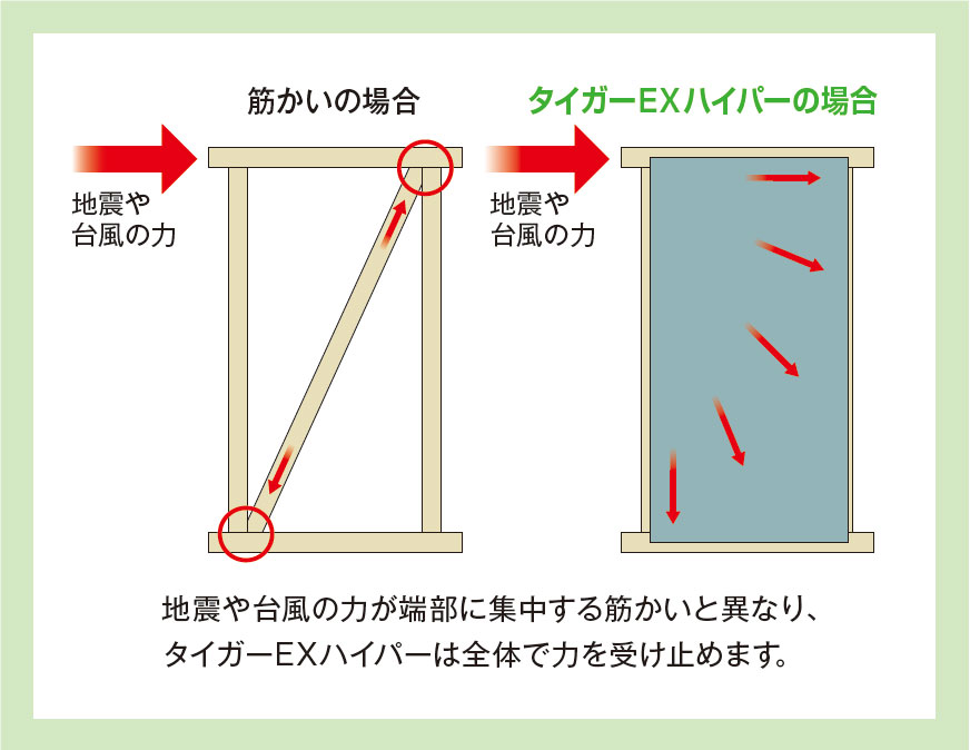 - 筋かいは端部のみの固定ですが、タイガー EXハイパーは全面を固定するため、一部にかかる負担が軽減されます。