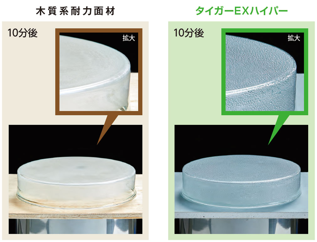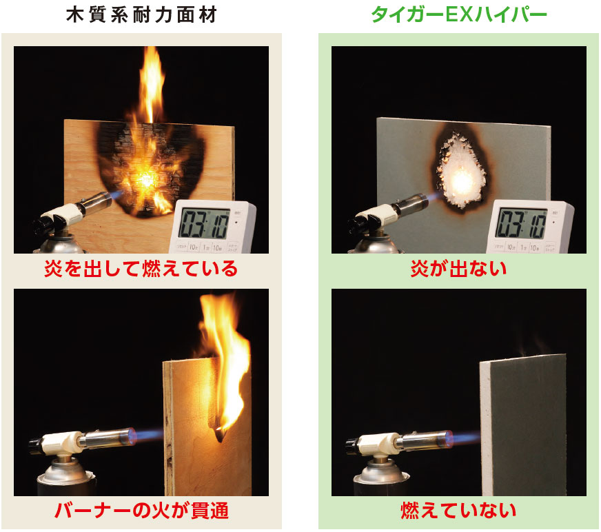 タイガーEXハイパーは木質系耐力面材と比べ、火に強く、燃えない建材です。