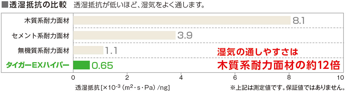 さらに透湿性の高さもポイント。壁内部に発生する結露は、土台や柱、壁などを腐食させる原因に。耐力面材の湿気の通しやすさは建物の耐久性を保つ重要な要素です。